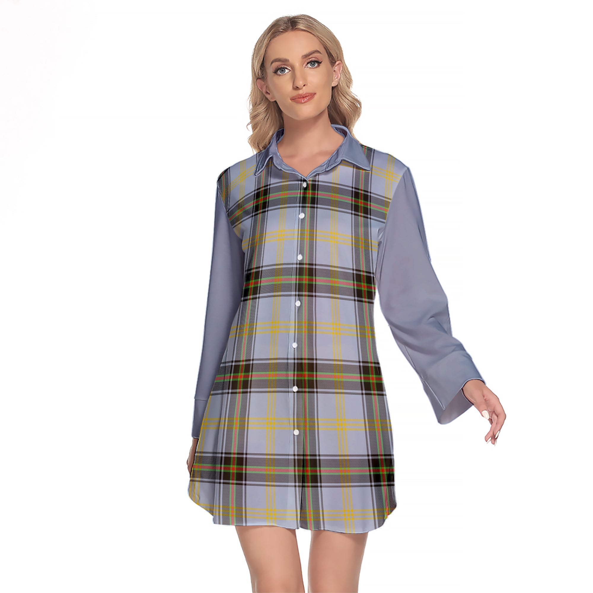 Bell Tartan Women's Lapel Shirt Dress With Long Sleeve