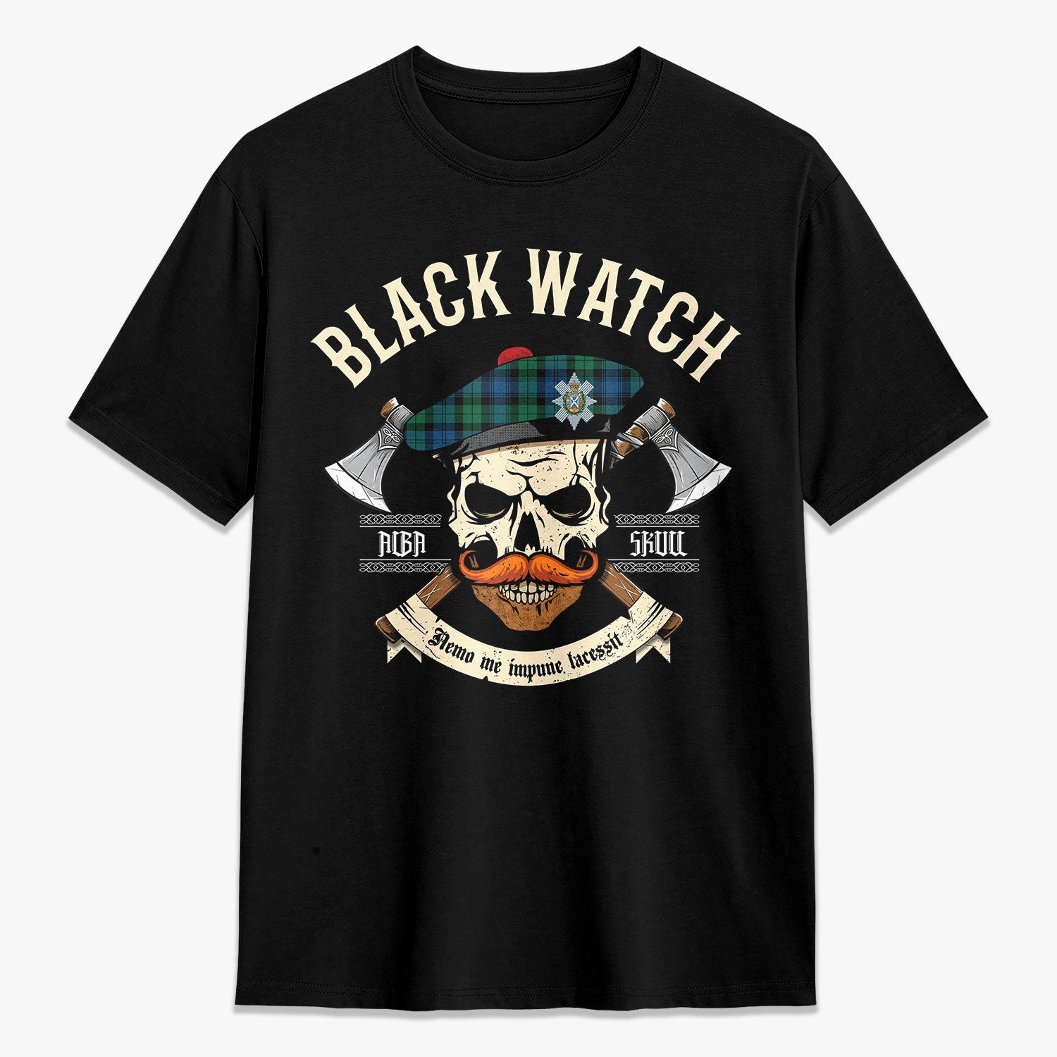 Black Watch Ancient Tartan Crest 2D T-shirt - Alba Skull Style,