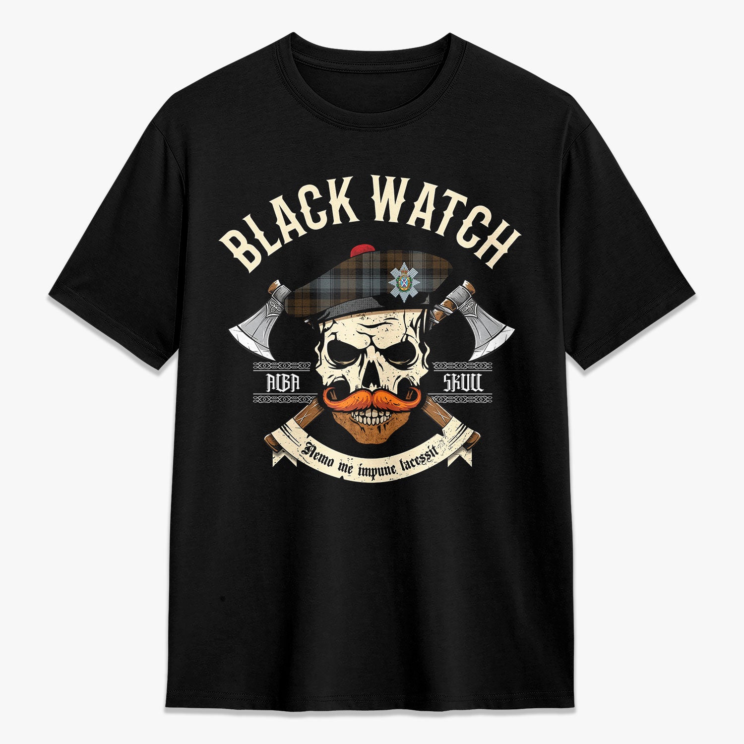 Black Watch Weathered Tartan Crest 2D T-shirt - Alba Skull Style,