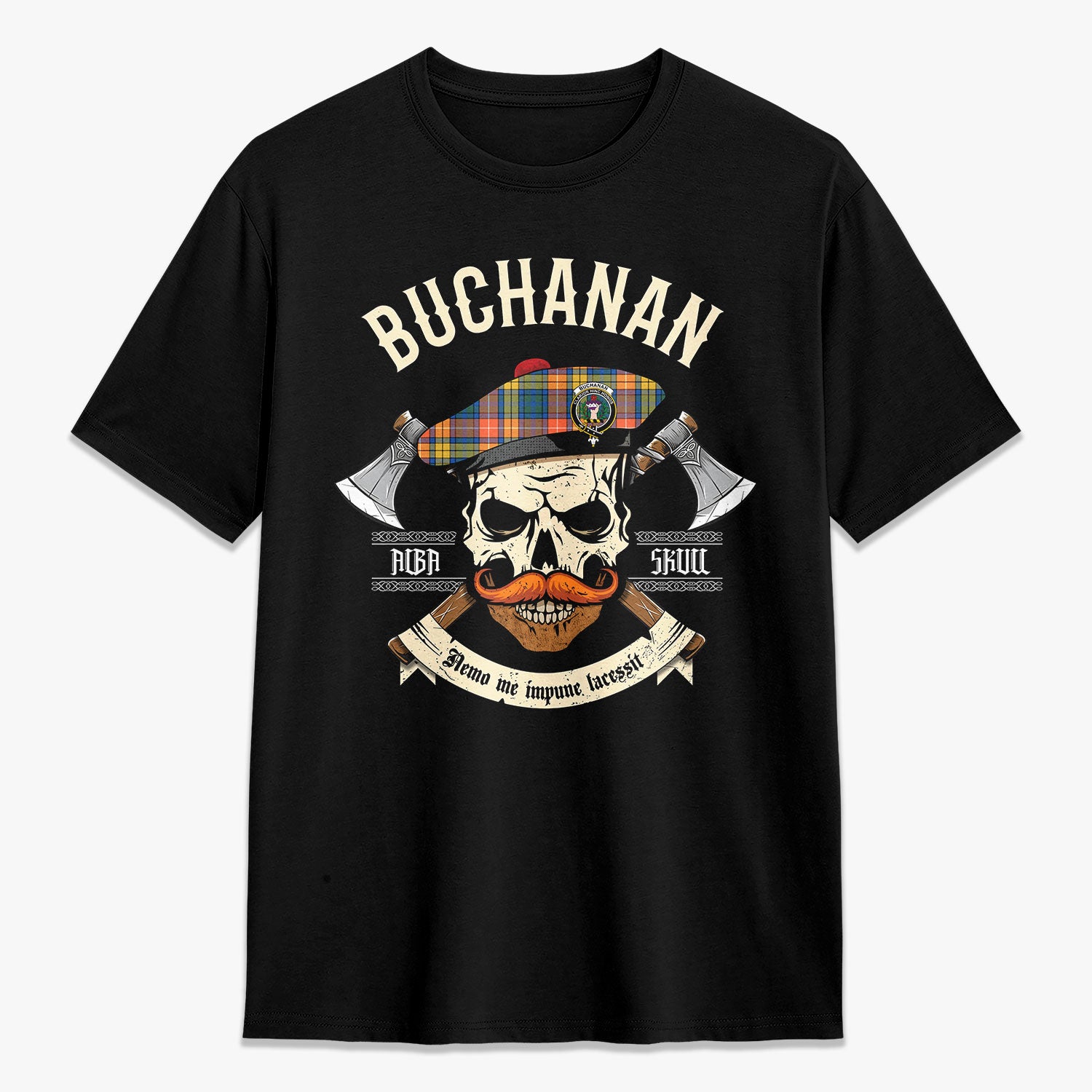 Buchanan Ancient Tartan Crest 2D T-shirt - Alba Skull Style,