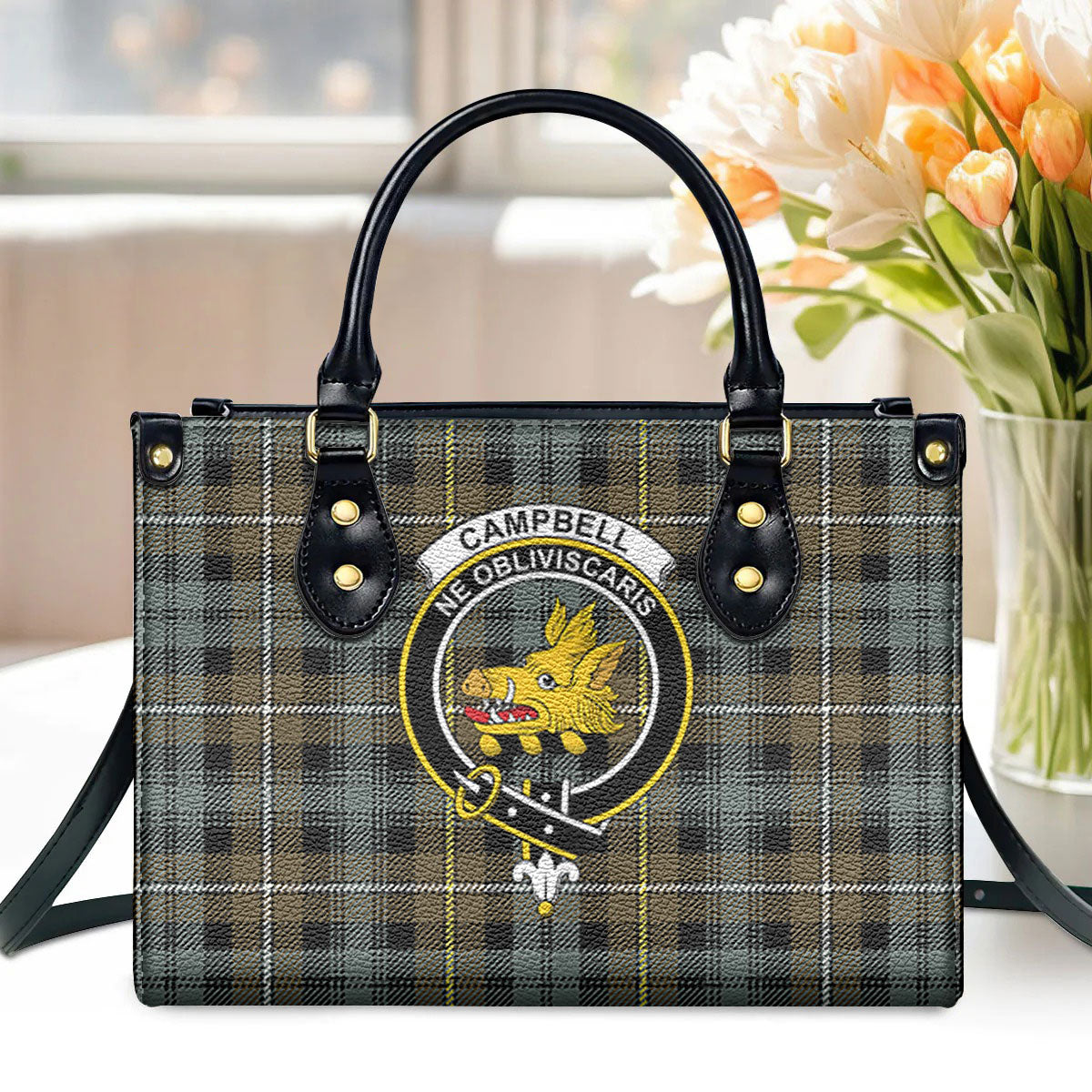Campbell Argyll Weathered Tartan Crest Leather Handbag
