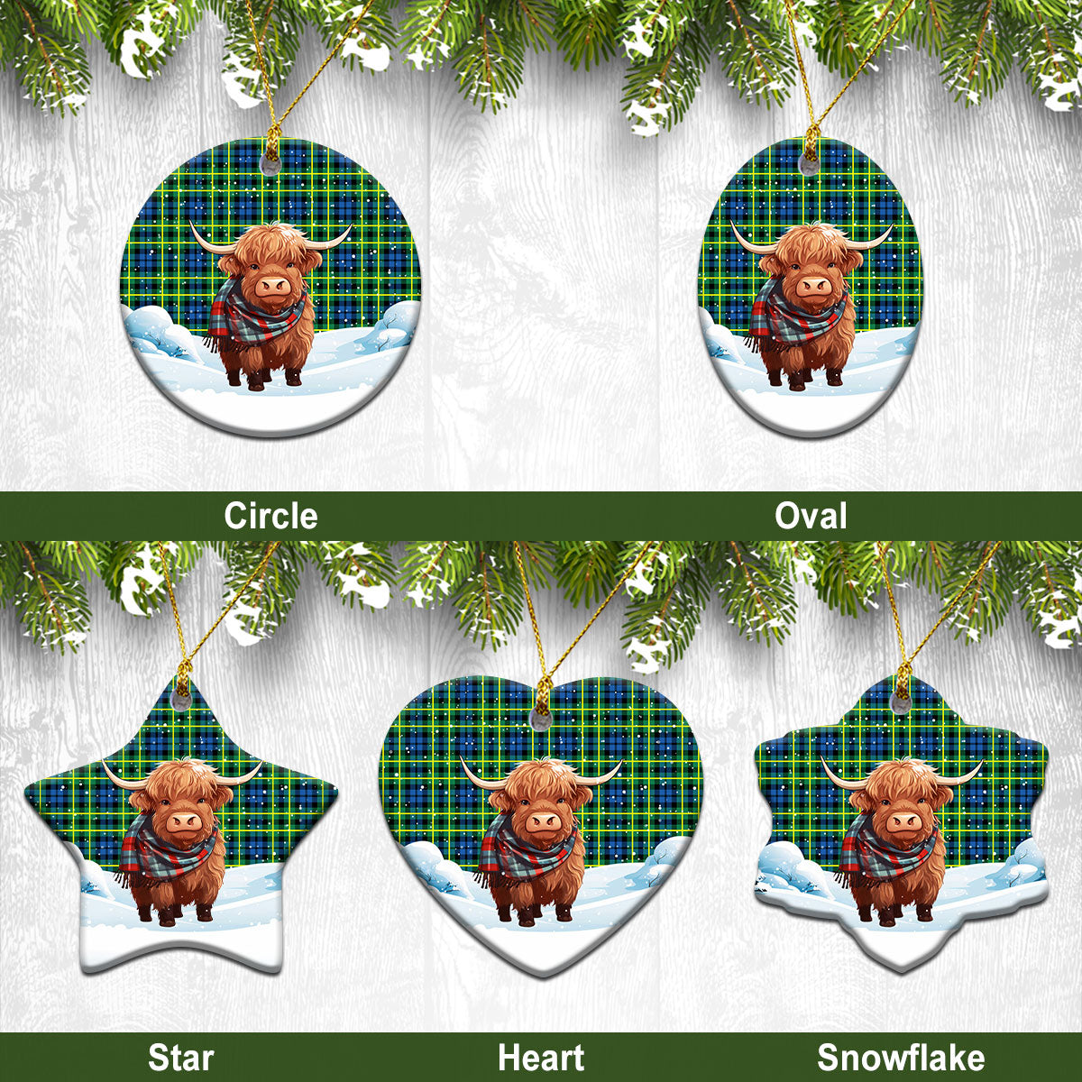Campbell of Breadalbane Ancient Tartan Christmas Ceramic Ornament - Highland Cows Snow Style