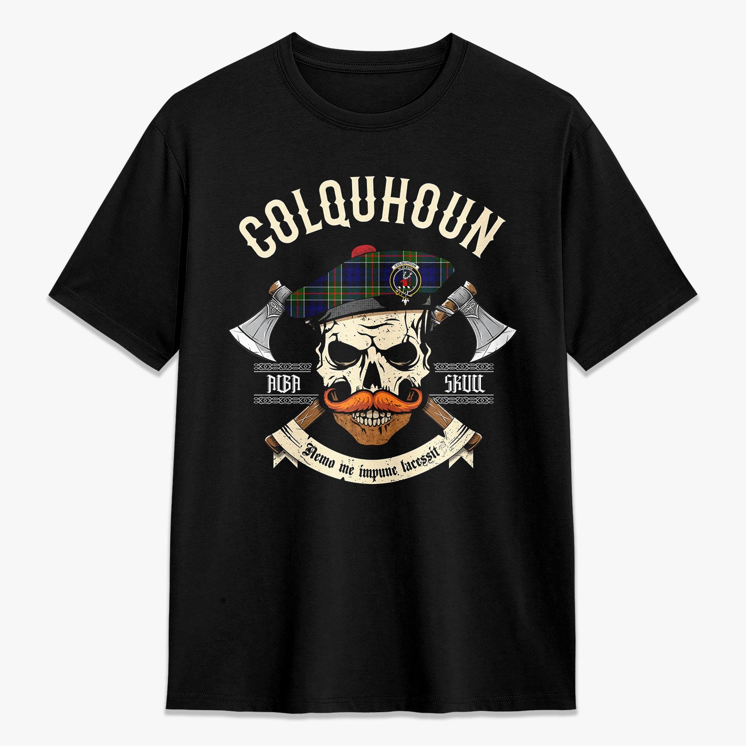 Colquhoun Modern Tartan Crest 2D T-shirt - Alba Skull Style,