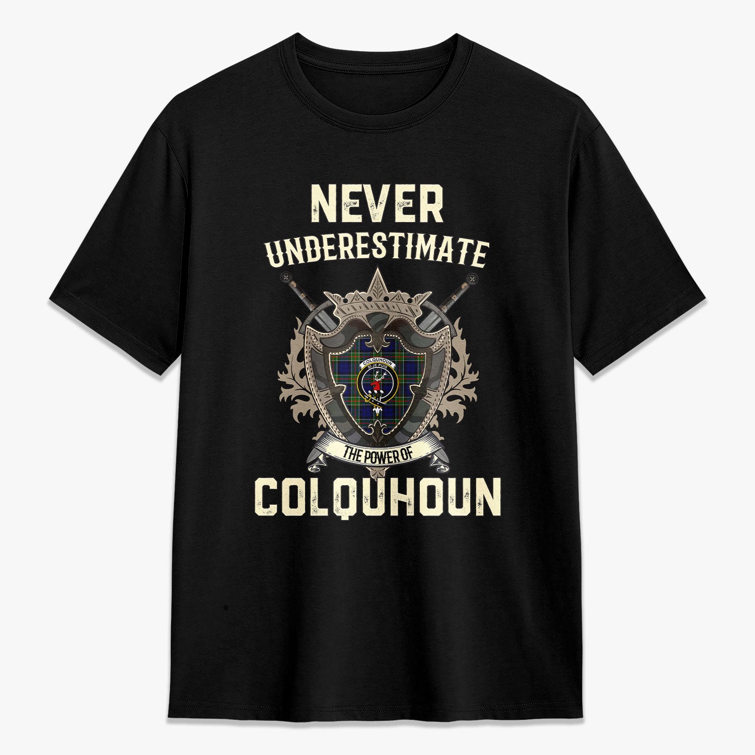 Colquhoun Modern Tartan Crest 2D T-shirt - Never Underestimate Style