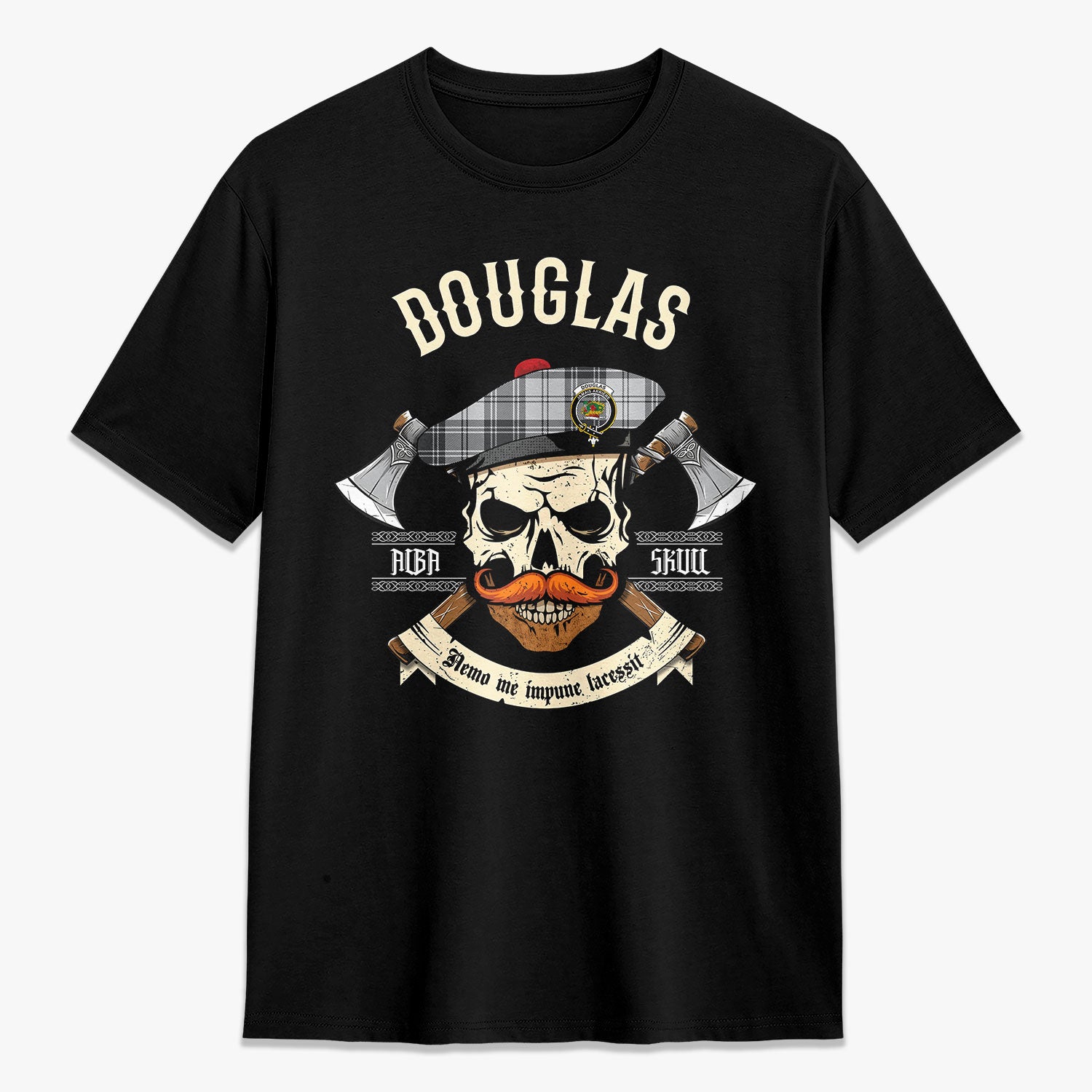 Douglas Grey Modern Tartan Crest 2D T-shirt - Alba Skull Style,