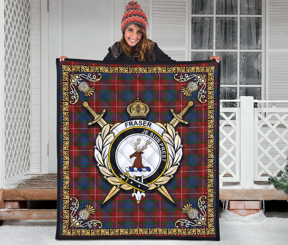 Fraser (of Lovat) Ancient Tartan Crest Premium Quilt - Celtic Thistle Style