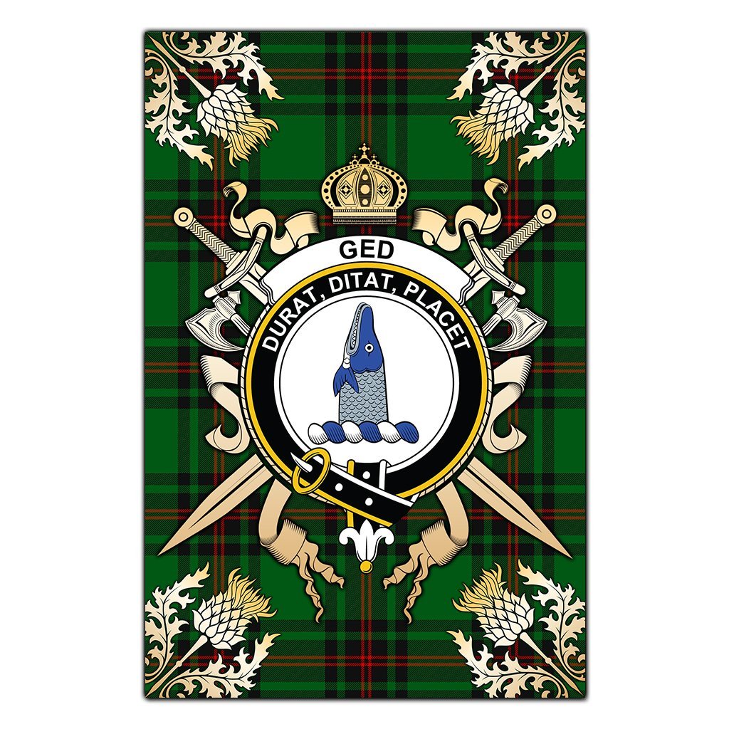 Ged Tartan Crest Black Garden Flag - Gold Thistle Style