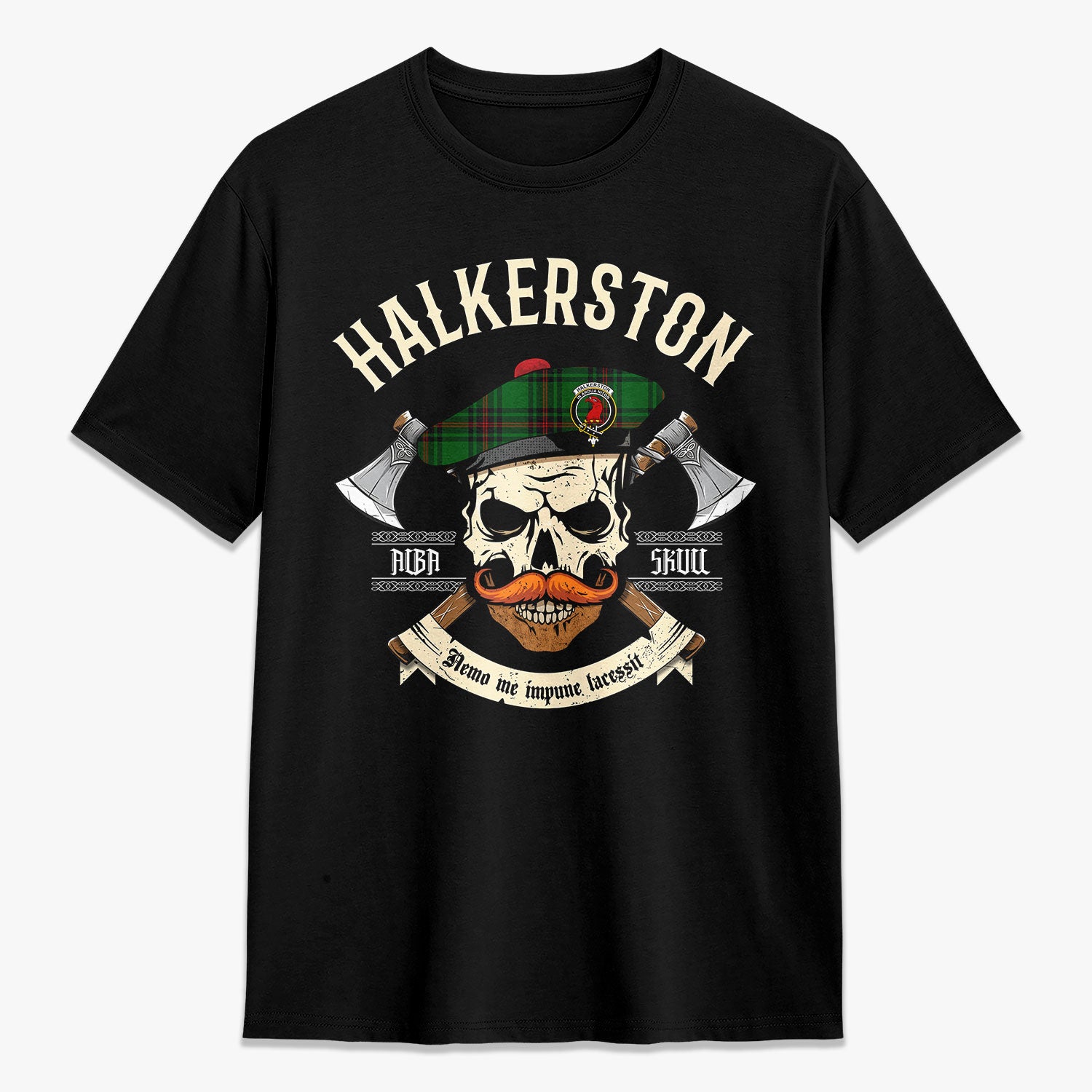 Halkerston Tartan Crest 2D T-shirt - Alba Skull Style,