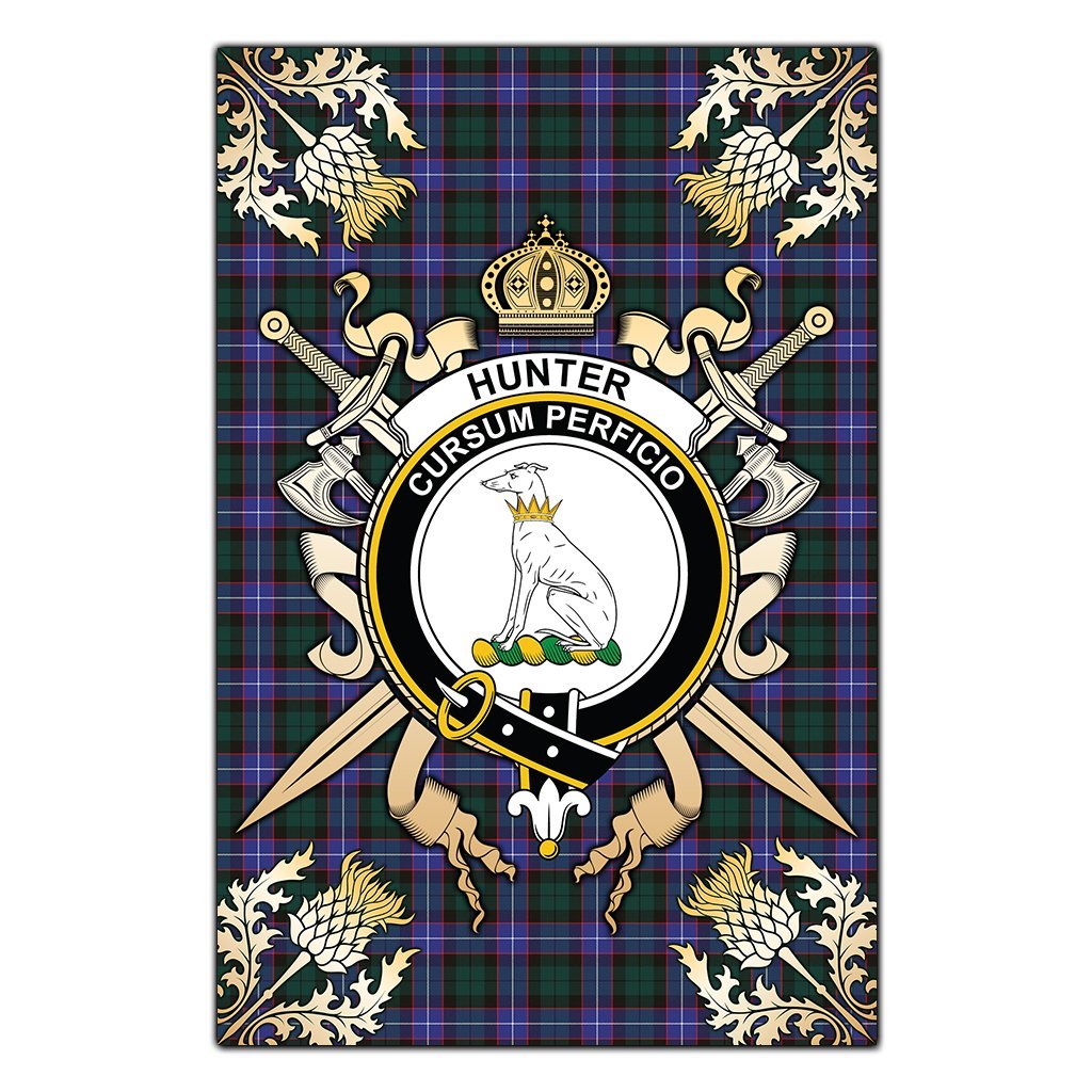 Hunter Modern Tartan Crest Black Garden Flag - Gold Thistle Style