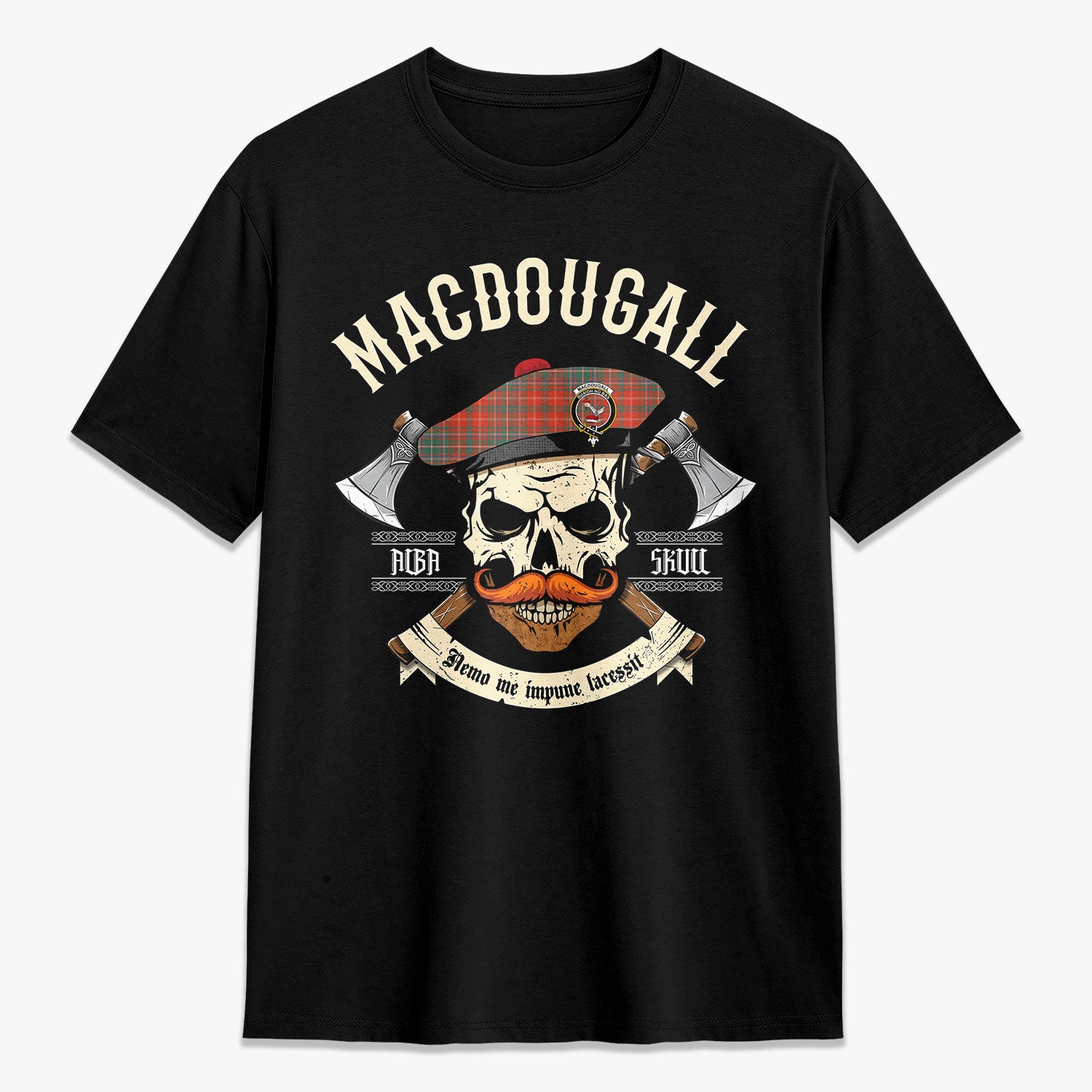 MacDougall Ancient Tartan Crest 2D T-shirt - Alba Skull Style