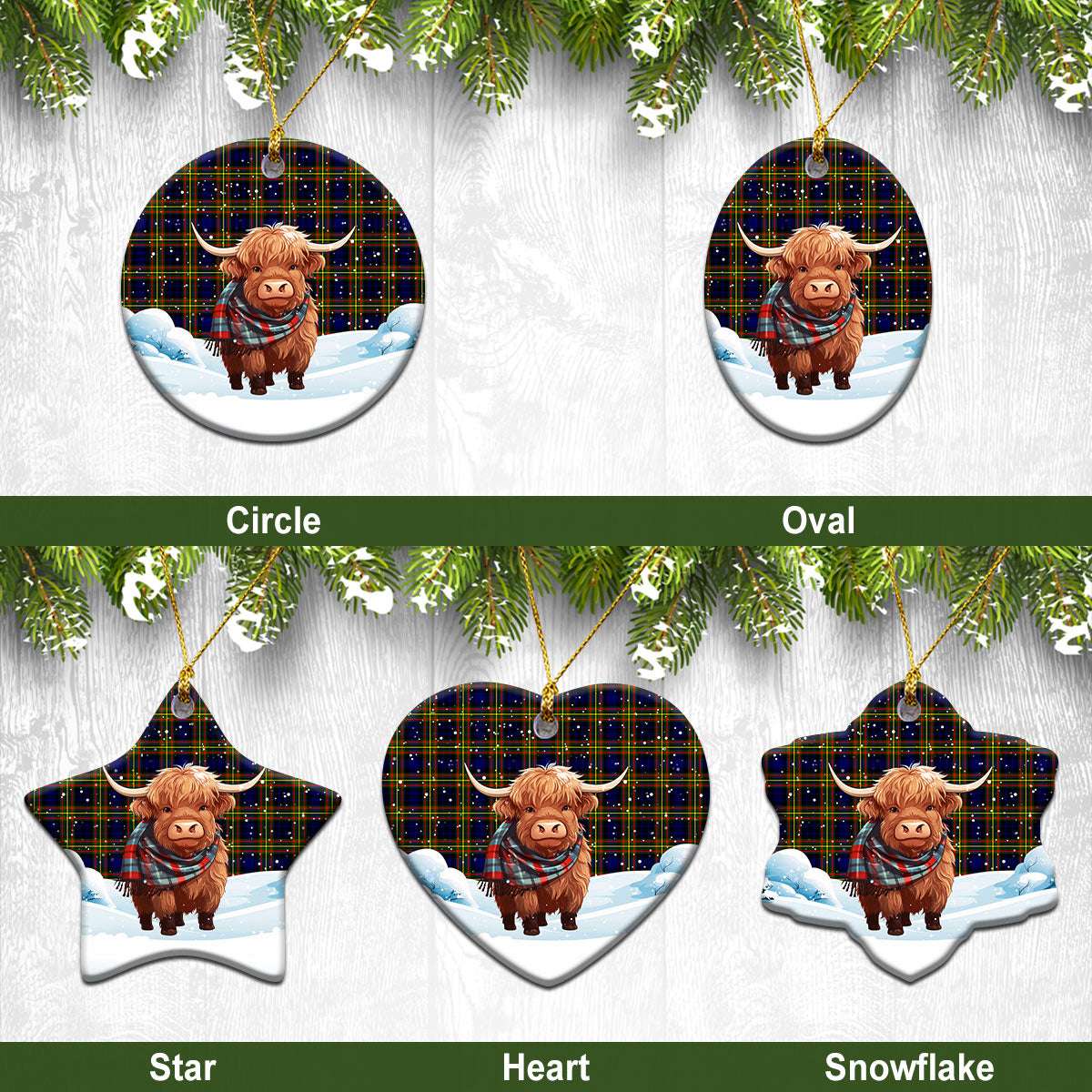 MacLellan Modern Tartan Christmas Ceramic Ornament - Highland Cows Snow Style