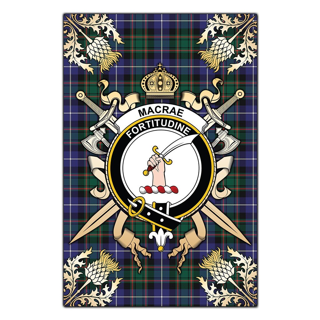 MacRae Hunting Modern Tartan Crest Black Garden Flag - Gold Thistle Style