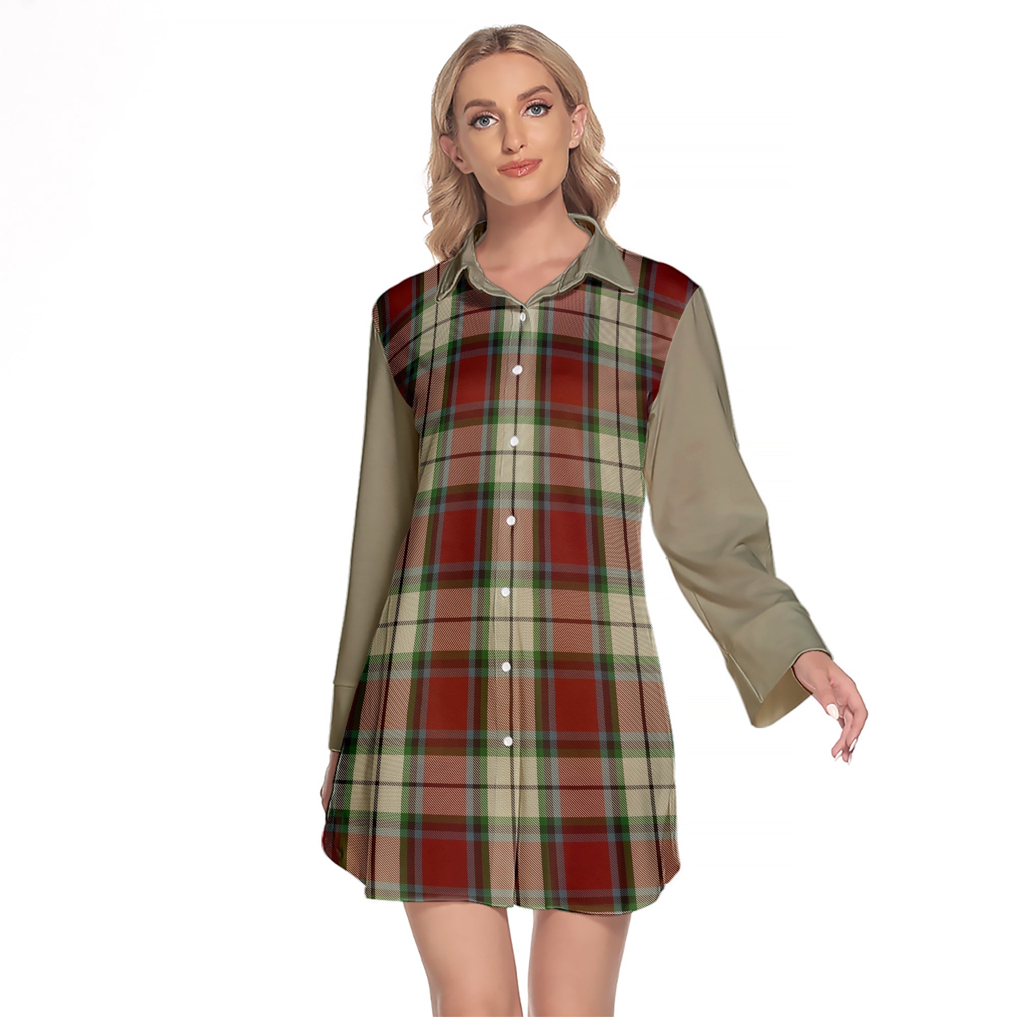 Rose White Dress Tartan Women's Lapel Shirt Dress With Long Sleeve