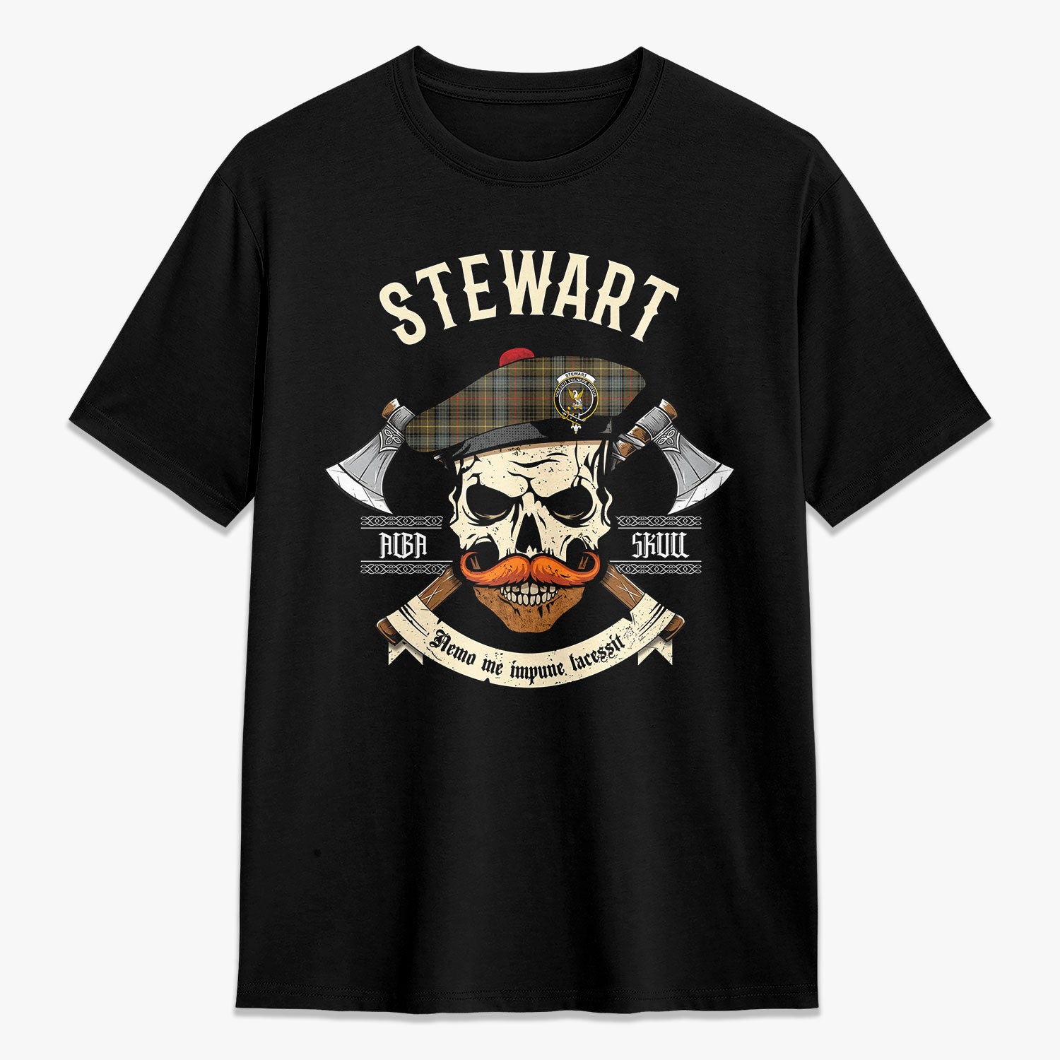 Stewart Hunting Weathered Tartan Crest 2D T-shirt - Alba Skull Style,