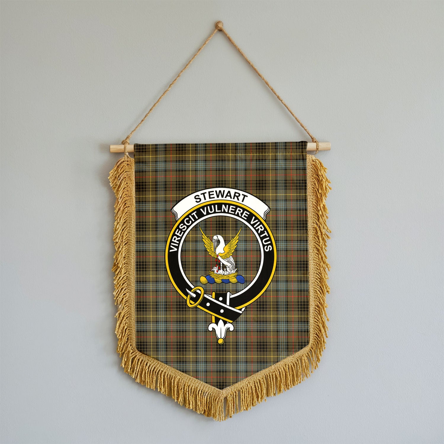 Stewart Hunting Weathered Tartan Crest Wall Hanging Banner - Wood Pole